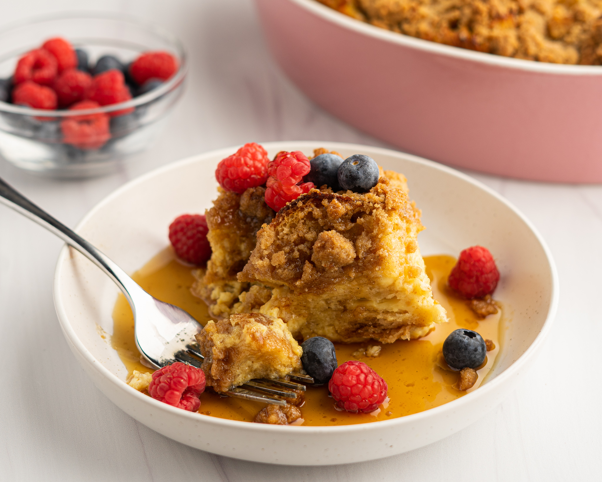 No one wants to spend too much time cooking breakfast on Christmas morning, so why not make it the night before? Here is a recipe that soaks overnight, so all that's left to do in the morning is bake! Think french toast meets bread pudding. Pro Tip: Use your favorite bread from Seven Stars Bakery for this recipe—we used their sourdough batard. 😍 The best part? It's crumbly, crunchy, and sweet topping.