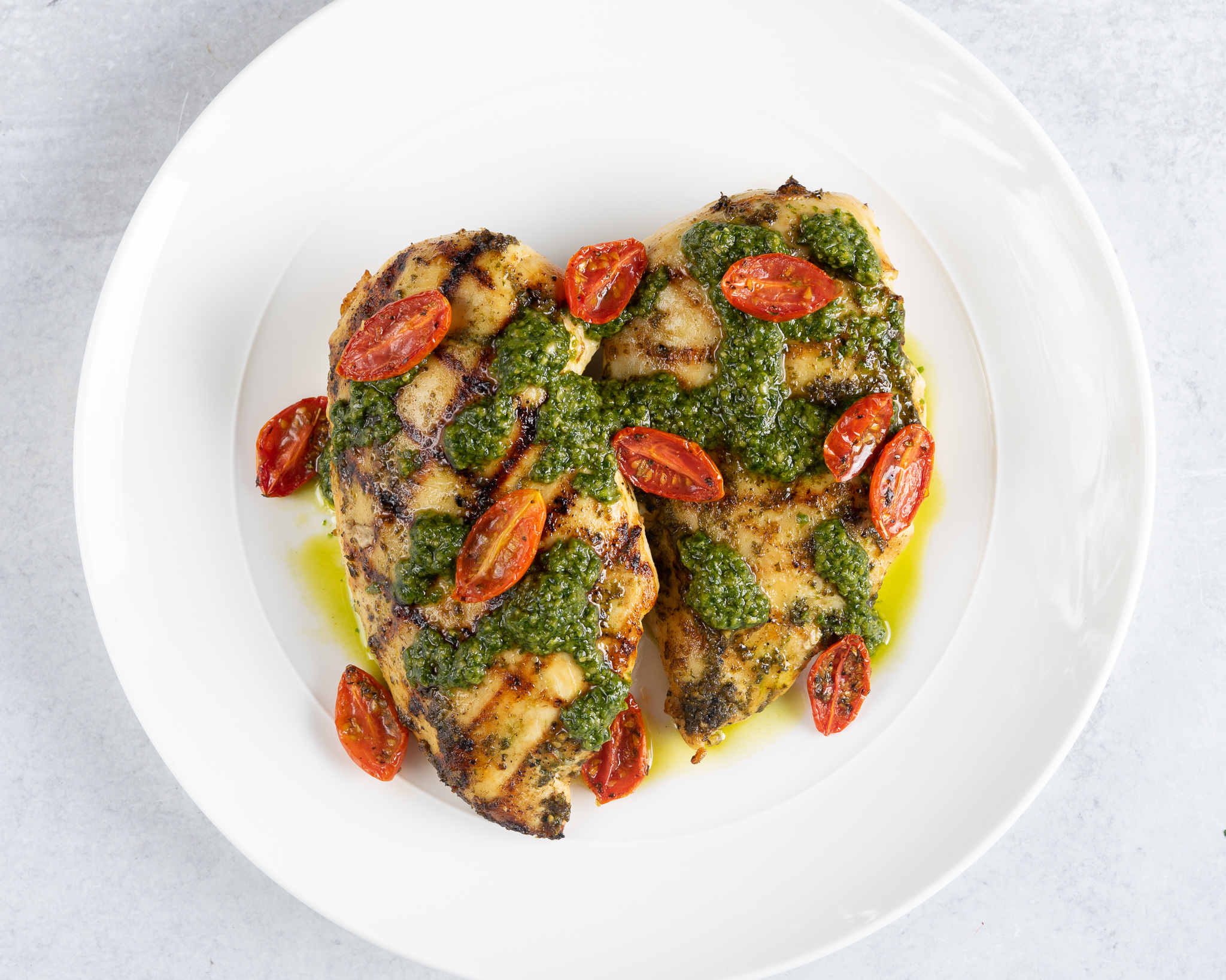 4. Serve grilled chicken with roasted grape tomatoes and drizzle with additional pesto sauce.