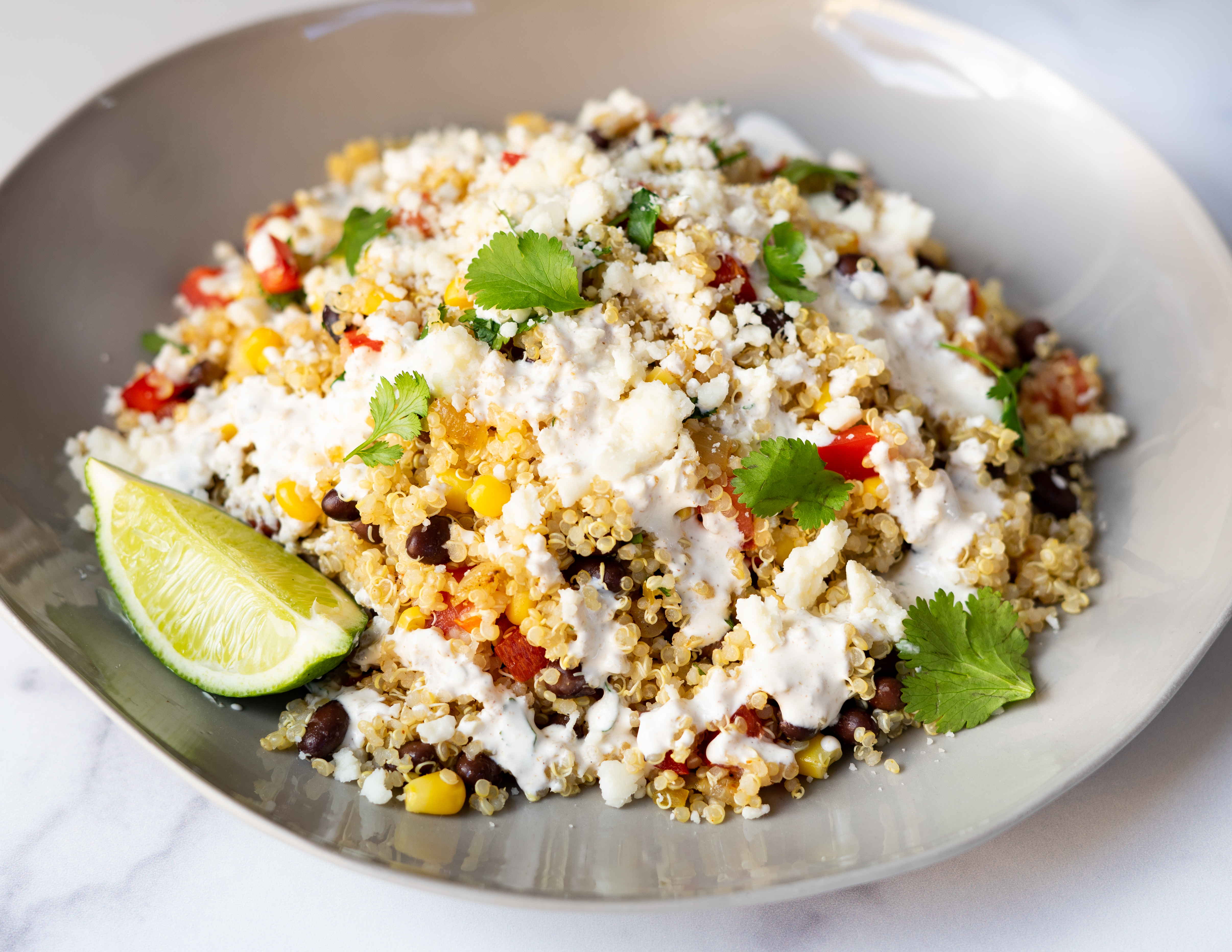4. Add the cooked onion mixture, black beans, corn, diced tomato, diced bell pepper and jalapeños to cooked quinoa. Toss well to combine. Add chopped cilantro and lime juice. Toss well to combine.