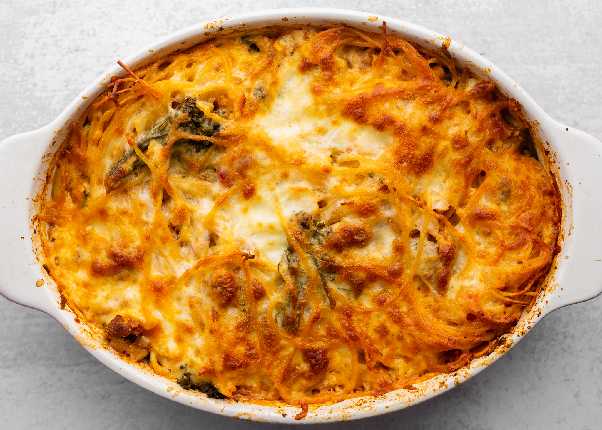 2. In a medium-sized casserole dish layer spaghetti, onion, garlic, marinara sauce, broccoli rabe, Italian sausage, and stock. Stir it together then place in the oven for 15 minutes.