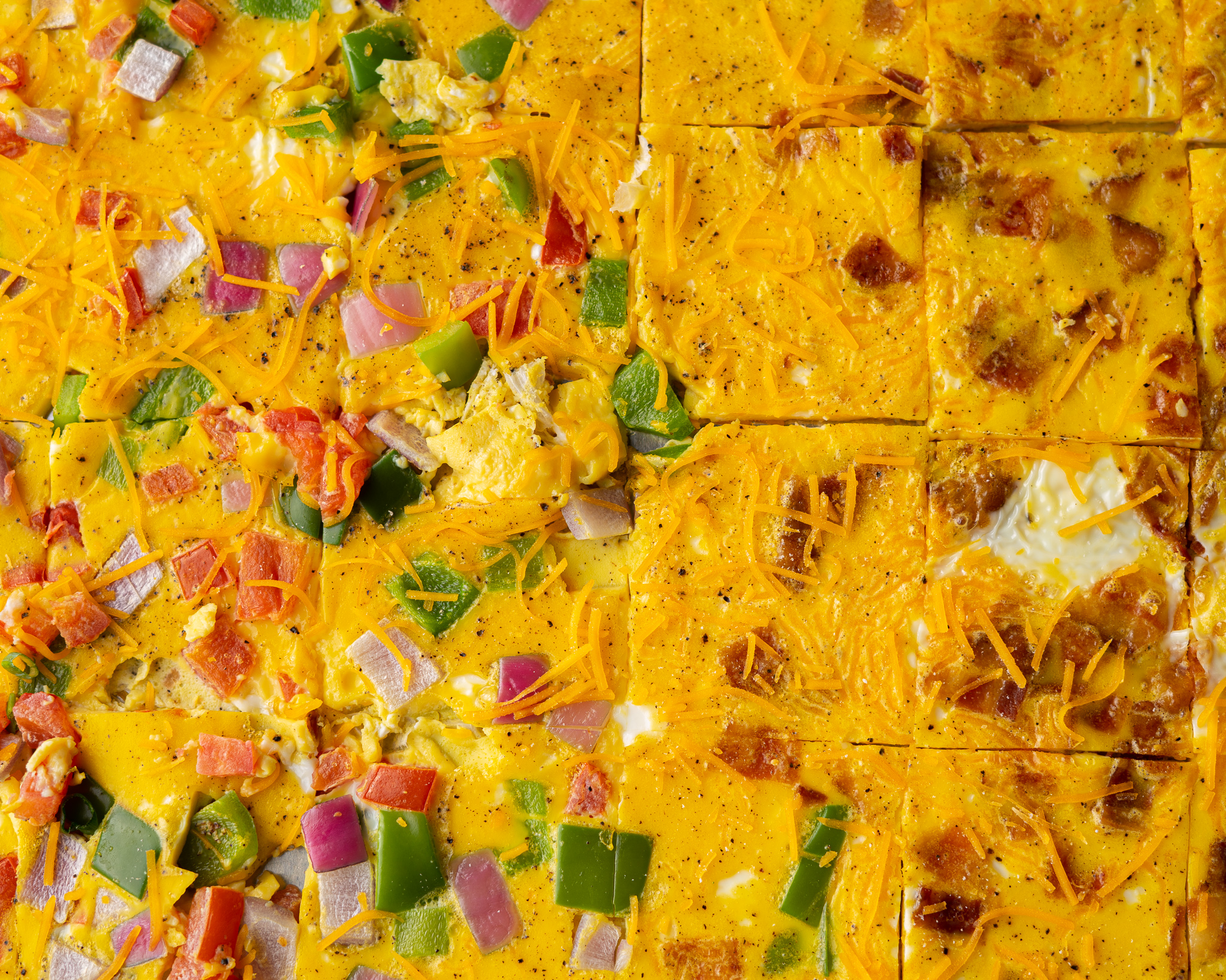 4. Pour the egg mixture evenly on the sheet pan over your fillings.
