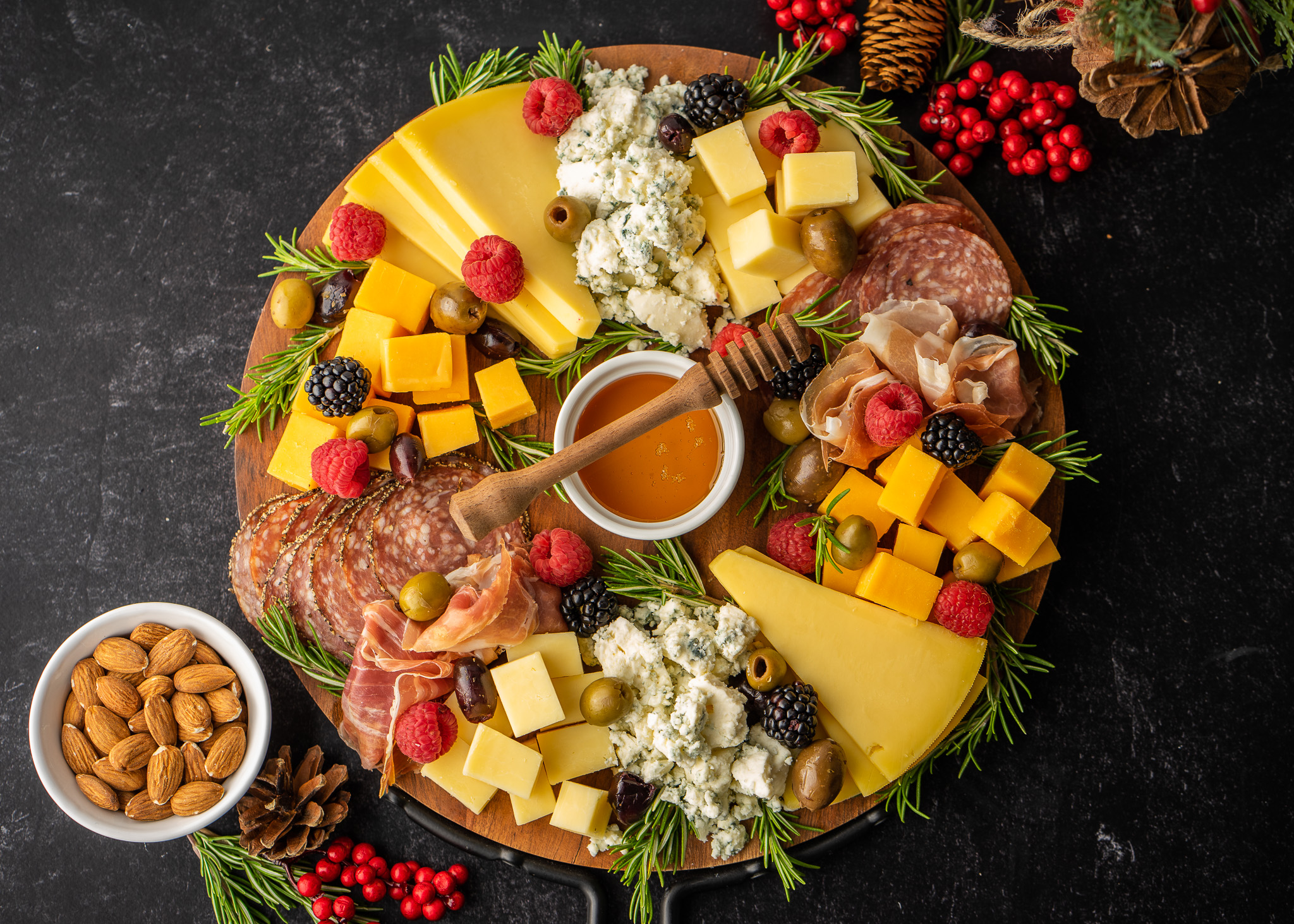 1. Start with a 20-inch round board. Divide all ingredients in half. Assemble board as pictured placing each ingredient across from the same ingredient. Place rosemary springs tucked around the board to create a "wreath" effect.